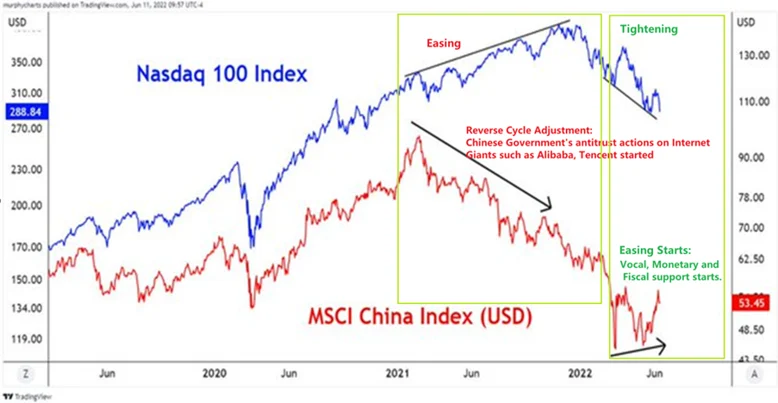 Cross/Reverse Cycle adjustment Since first quarter of 2022 – easing monetary and fiscal policies vs global tightening (rate hikes). China issued a basket of easing policies including interest rate cut, tax reduction, support for the healthy development of platform economies (internet giants) and huge “new” infrastructure spending plans (5G, dispatchable renewable energy, smart city, IoTs, cloud, digital economy etc.).