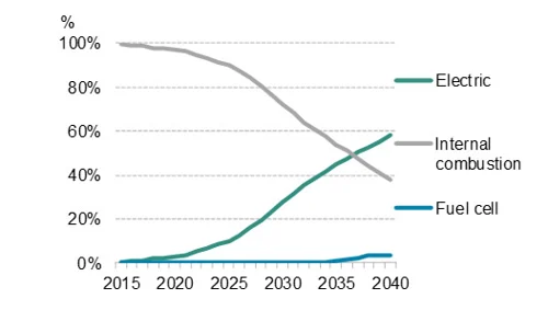 Global share estimates of total annual passenger vehicle sales by drivetrain – Source: Bloomberg NEF